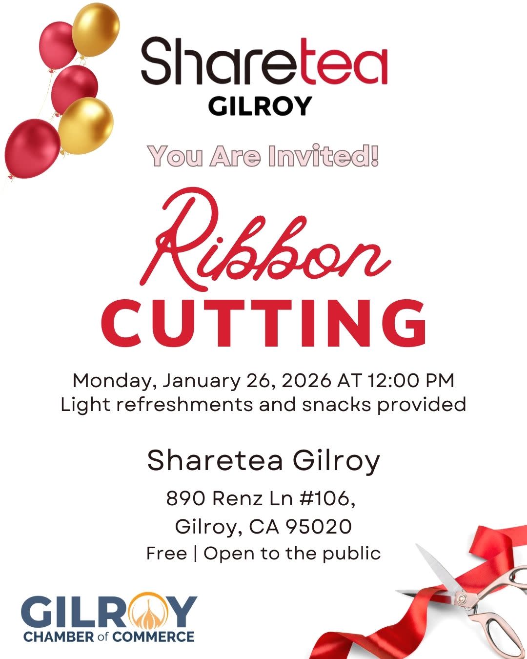 Join us for a special ceremony to celebrate the grand opening of Sharetea in Gilroy! This event will showcase their boba, offerings, and family behind the business. This event is free and open to the public.